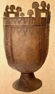 • Форма: вытянутое тулово на массивном конусообразном поддоне. По бокам – две огромные П-образные ручки, увенчанные характерными грибовидными выступами, стилизованными под Древо жизни.