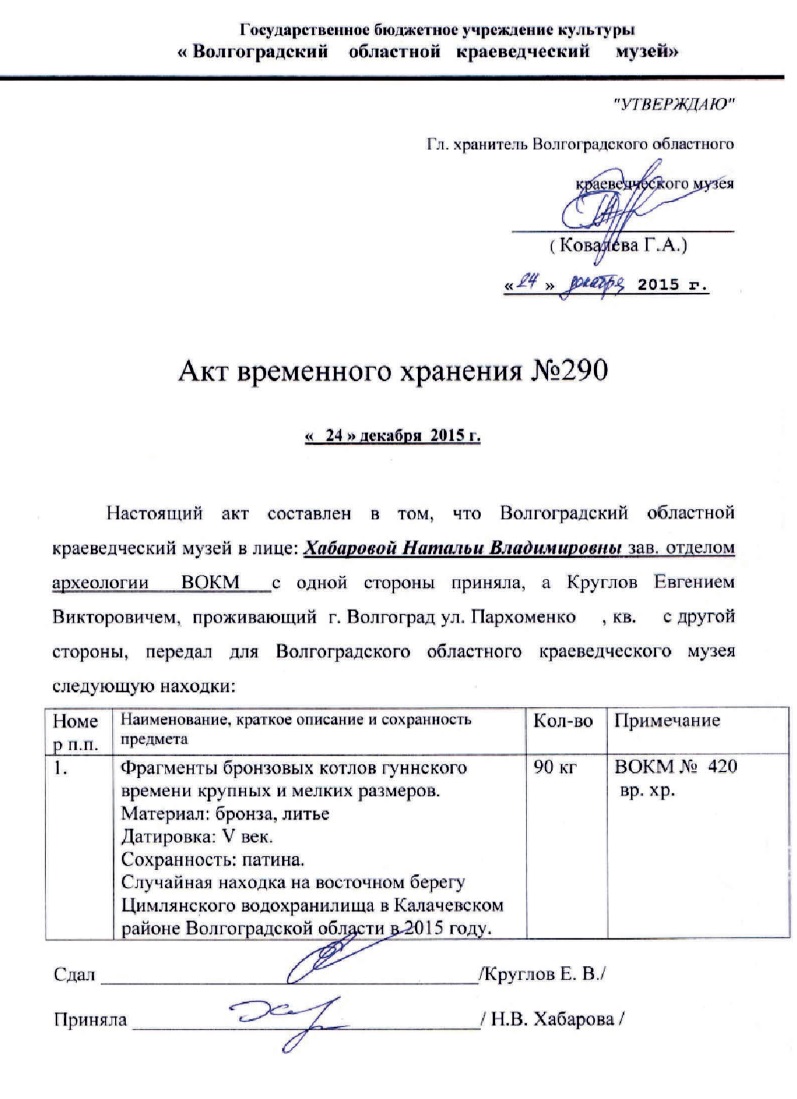 К середине декабря все формальности были улажены. Главная цель была достигнута: бесформенная масса обломков около 197 фрагментов общим весом почти 90 кг, сложенная в три большие сумки, была доставлена в Волгоградский областной краеведческий музей. Передачу принимала начальник отдела археологии музея Наталья Владимировна Хабарова, опытный специалист, хорошо знающая древности региона. Для неё, как для профессионала, эта коробка с фрагментами стала, без преувеличения, лучшим новогодним подарком. Она сразу оценила масштаб находки.