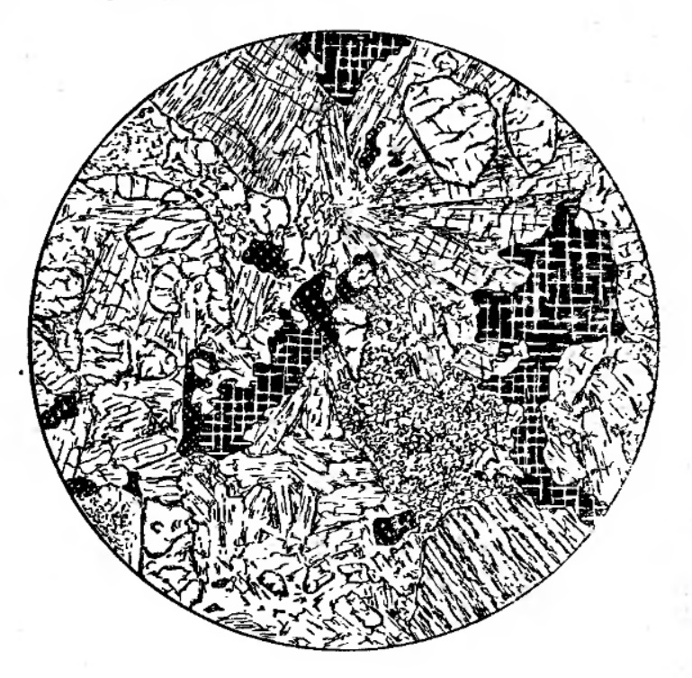 На (рис. 2) видна маленькая хондра с тонким эксцентрически-лучистым строением (слева вверху); в нижней части видна изменённая микропорфировая хондра эллиптических очертаний, примыкающая к сростку троилита и железа. На большей части изображённого на рисунке участка перекристаллизация стёрла следы первоначальной структуры3.